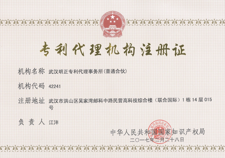 明上知識產(chǎn)權(quán)配合國家專利局的工作,于2017年2月28日,正式成立明正專利代理事務(wù)所,并且已在國家專利局備案,取得專利代理機(jī)構(gòu)注冊證。旨在培育一批專業(yè)化、國際化的知識產(chǎn)權(quán)服務(wù)者,為市場主體和創(chuàng)新主體的知識產(chǎn)權(quán)發(fā)展提供有效支撐和保障,也為明上的新老客戶提供更專業(yè)更優(yōu)質(zhì)的專利代理服務(wù)!