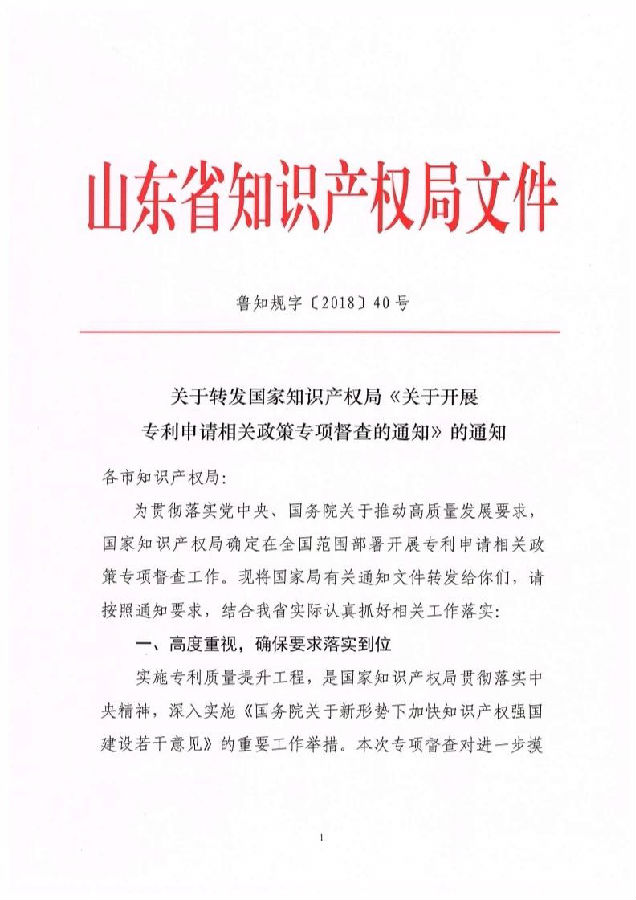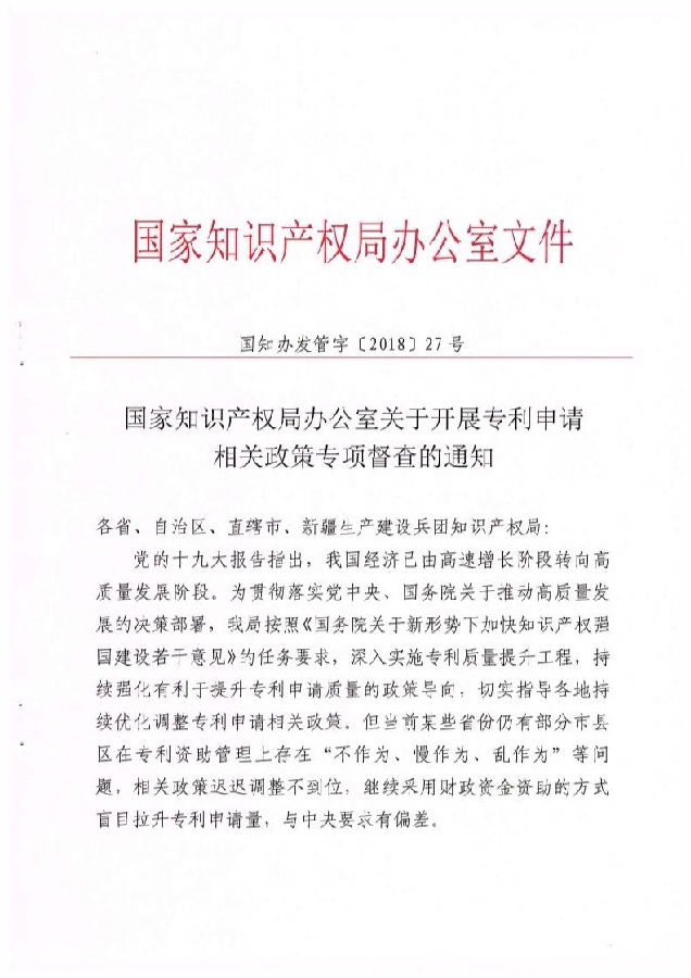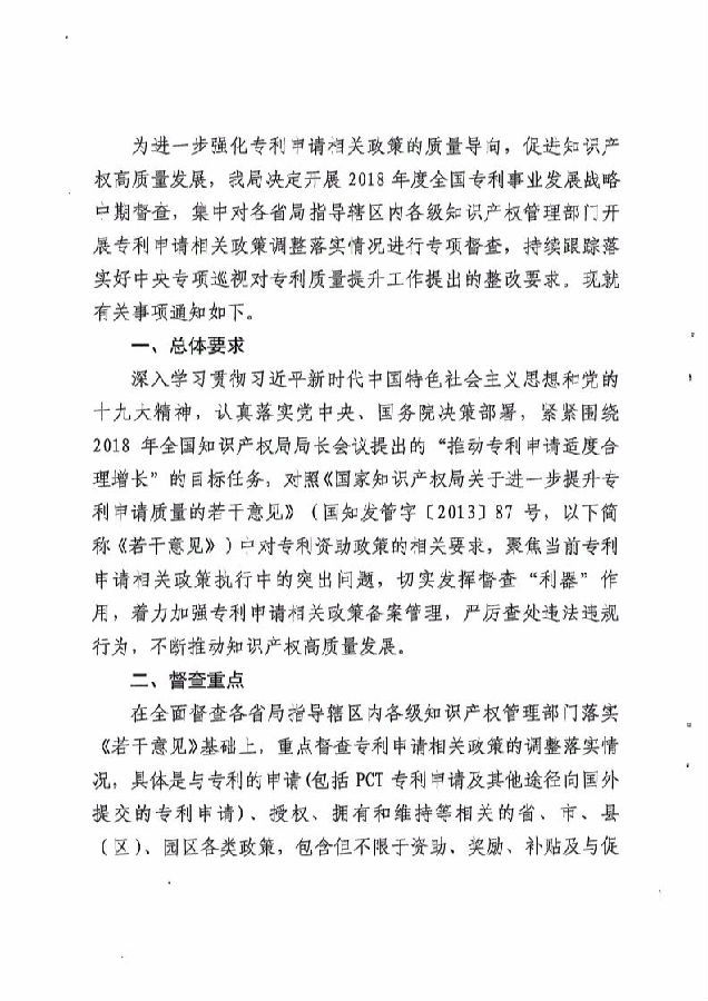 為進(jìn)一步強(qiáng)化專利申請(qǐng)相關(guān)政策的質(zhì)量導(dǎo)向,促進(jìn)知識(shí)產(chǎn)權(quán)高質(zhì)量發(fā)展,我局決定開展2018年度全國(guó)專利事業(yè)發(fā)展戰(zhàn)略中期督查,集中對(duì)各省局指導(dǎo)轄區(qū)內(nèi)各級(jí)知識(shí)產(chǎn)權(quán)管理部門開展專利申請(qǐng)相關(guān)政策調(diào)整落實(shí)情況進(jìn)行專項(xiàng)督査,持續(xù)跟蹤落實(shí)好中央專項(xiàng)巡視對(duì)專利質(zhì)量提升工作提出的整改要求?,F(xiàn)就有關(guān)事項(xiàng)通知如下。