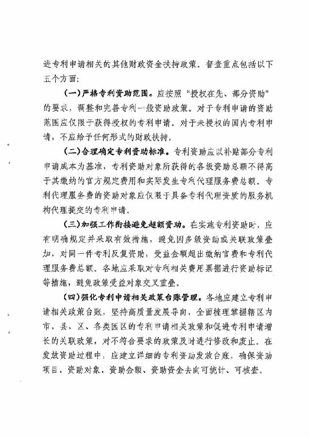 在全面督查各省局指導(dǎo)轄區(qū)內(nèi)各級(jí)知識(shí)產(chǎn)權(quán)管理部門落實(shí)《若干意見(jiàn)》基礎(chǔ)上,重點(diǎn)督查專利申請(qǐng)相關(guān)政策的調(diào)整落實(shí)情況,具體是與專利的申請(qǐng)(包括PCT專利申請(qǐng)及其他途徑向國(guó)外提交的專利申請(qǐng))、授權(quán)、擁有和維持等相關(guān)的省、市、縣(區(qū))、園區(qū)各類政策,包含但不限于資助、獎(jiǎng)勵(lì)、補(bǔ)貼及與促進(jìn)專利申請(qǐng)相關(guān)的其他財(cái)政資金扶持政策。督查重點(diǎn)包括以下五個(gè)方面: