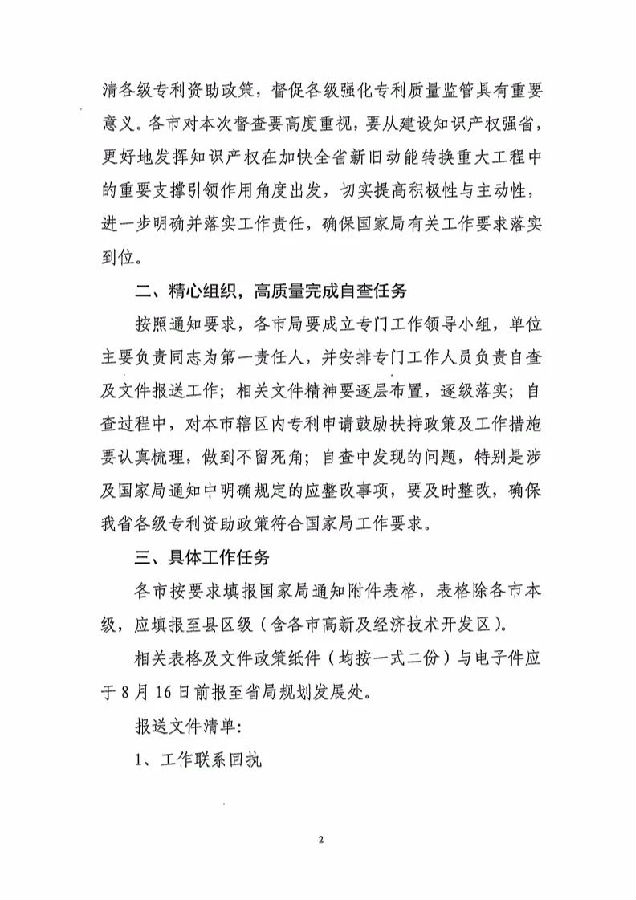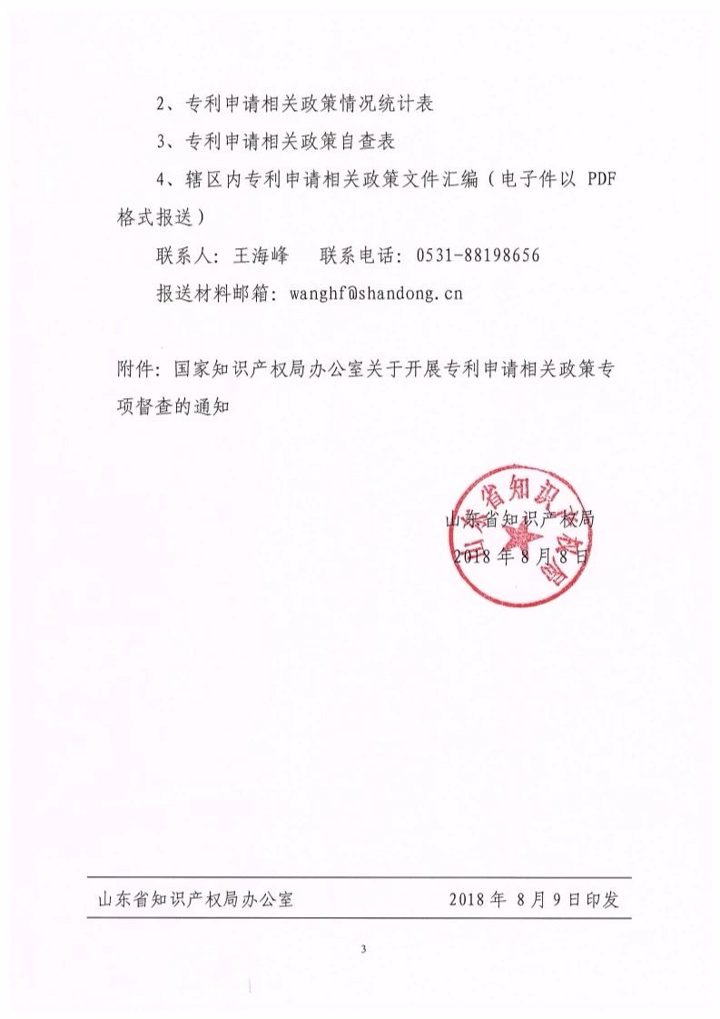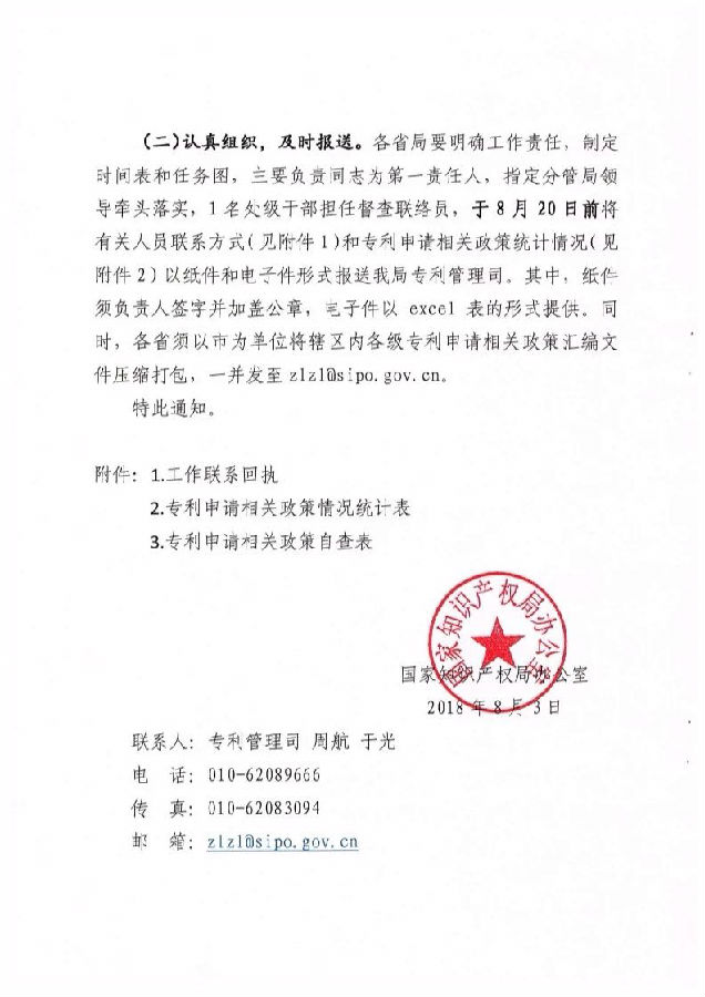 (二)認(rèn)真組織,及時(shí)報(bào)送。各省局要明確工作責(zé)任,制定時(shí)間表和任務(wù)圖,主要負(fù)責(zé)同志為第一責(zé)任人,指定分管局領(lǐng)導(dǎo)牽頭落實(shí),1名處級(jí)干部擔(dān)任督查聯(lián)絡(luò)員,于8月20日前將有關(guān)人員聯(lián)系方式(見(jiàn)附件1)和專利申請(qǐng)相關(guān)政策統(tǒng)計(jì)情況(見(jiàn)附件2)以紙件和電子件形式報(bào)送我局專利管理司。其中,紙件須負(fù)責(zé)人簽字并加蓋公章,電子件以 excel表的形式提供。同時(shí),各省須以市為單位將轄區(qū)內(nèi)各級(jí)專利申請(qǐng)相關(guān)政策匯編文件壓縮打包,一并發(fā)至z1 zas ipo.gov.cn。