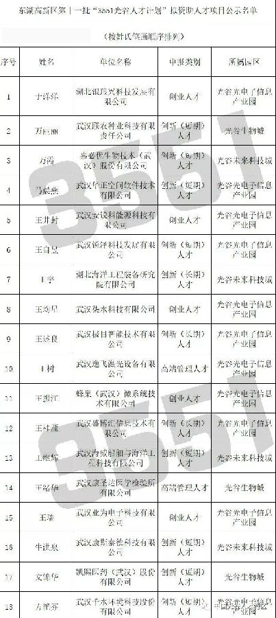 武漢東湖高新區(qū)第十一批“3551光谷人才計劃” 擬資助人才項目公示公告