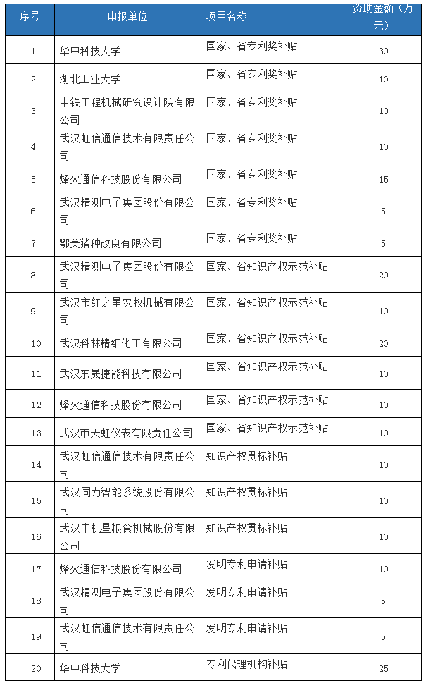 本次資金撥付對(duì)象為獲得洪山區(qū)2018年度洪山區(qū)知識(shí)產(chǎn)權(quán)項(xiàng)目資金的企業(yè),名單及資助金額見(jiàn)附件。