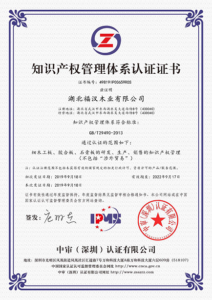 熱烈祝賀湖北福漢木業(yè)有限公司于2019年9月獲得知識產(chǎn)權(quán)貫標(biāo)認(rèn)證證書,這意味著湖北福漢木業(yè)在知識產(chǎn)權(quán)領(lǐng)域獲得到重要認(rèn)可,在知識產(chǎn)權(quán)方面得到進(jìn)一步規(guī)范和在綜合競爭力得到進(jìn)一步提升。