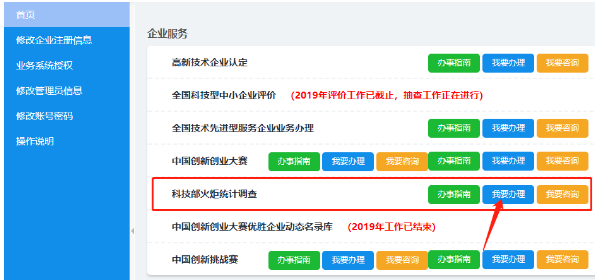 進入『科技部火炬統(tǒng)計調(diào)查』-『我要辦理』;