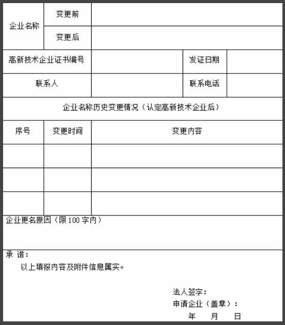 (1)高新技術(shù)企業(yè)發(fā)生名稱變更或與認(rèn)定條件有關(guān)的重大變化(如分立、合并、重組以及經(jīng)營業(yè)務(wù)發(fā)生變化等),應(yīng)在發(fā)生之日起三個月內(nèi)向認(rèn)定機(jī)構(gòu)報告,在“高新技術(shù)企業(yè)認(rèn)定管理工作網(wǎng)”上提交《高新技術(shù)企業(yè)名稱變更申請表》(附件7---見后文表單),并將打印出的《高新技術(shù)企業(yè)名稱變更申請表》與相關(guān)證明材料報認(rèn)定機(jī)構(gòu),由認(rèn)定機(jī)構(gòu)負(fù)責(zé)審核企業(yè)是否仍符合高新技術(shù)企業(yè)條件。